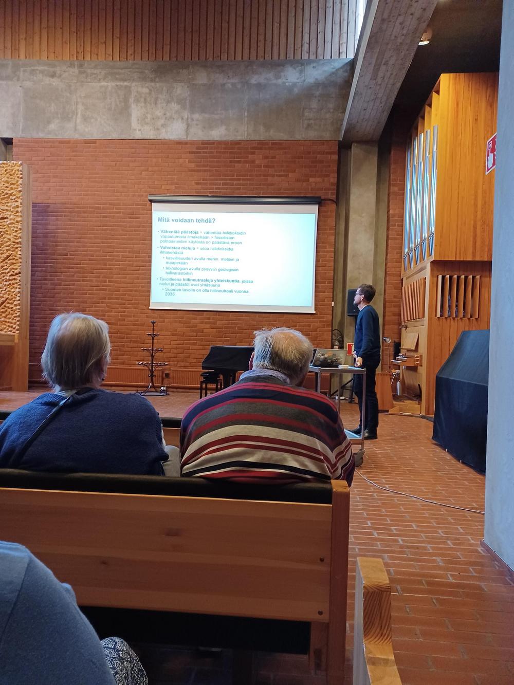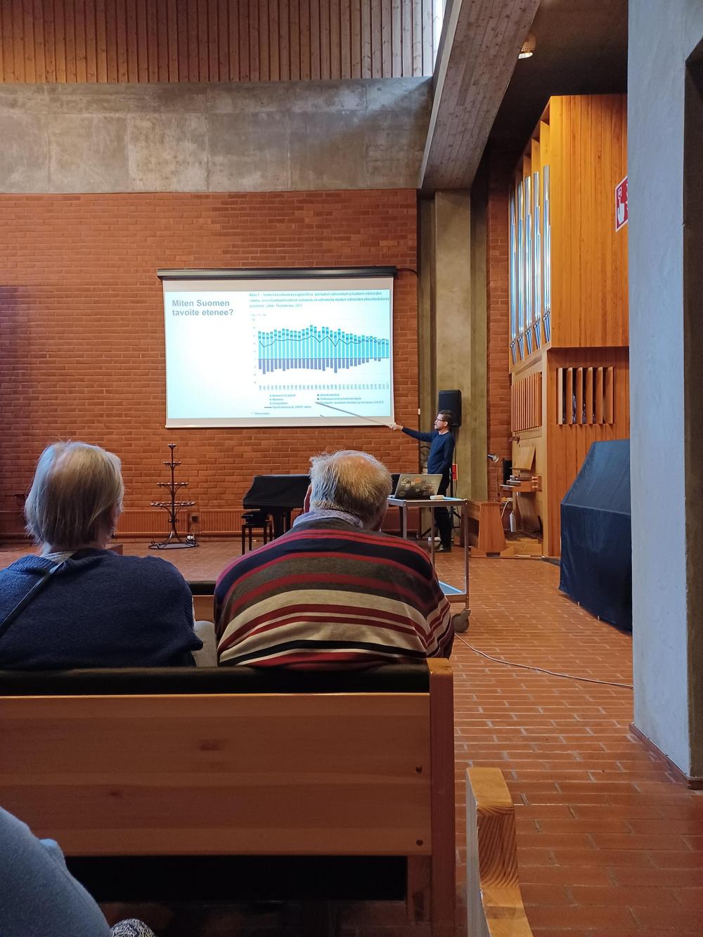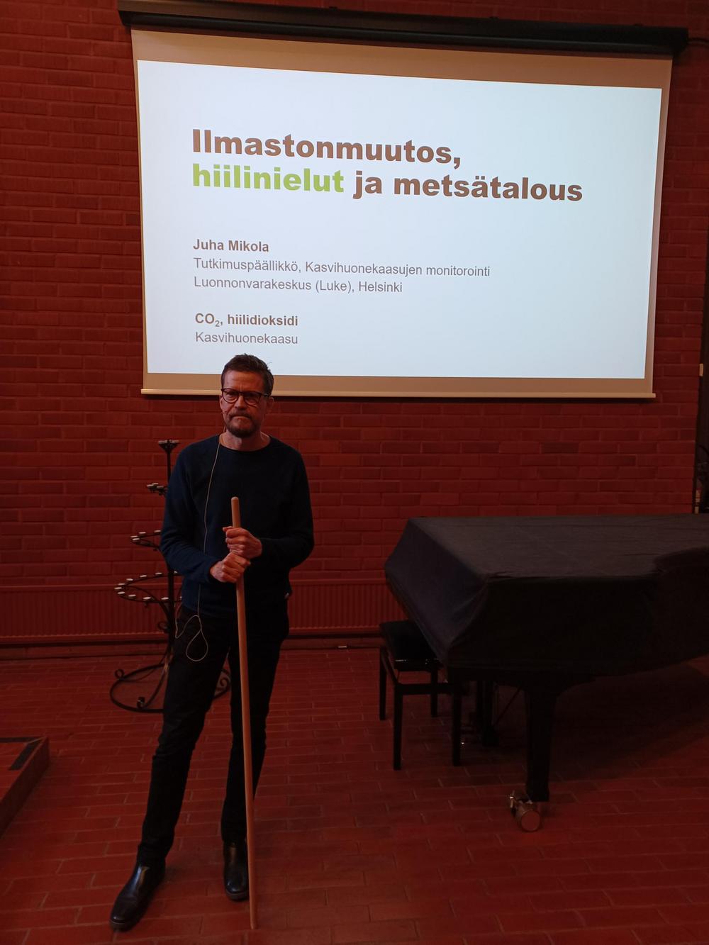 Tutkimuspäällikkö Juha Mikola luennoi ilmastomuutoksesta ja hiilinieluista ja metsätaloudesta.